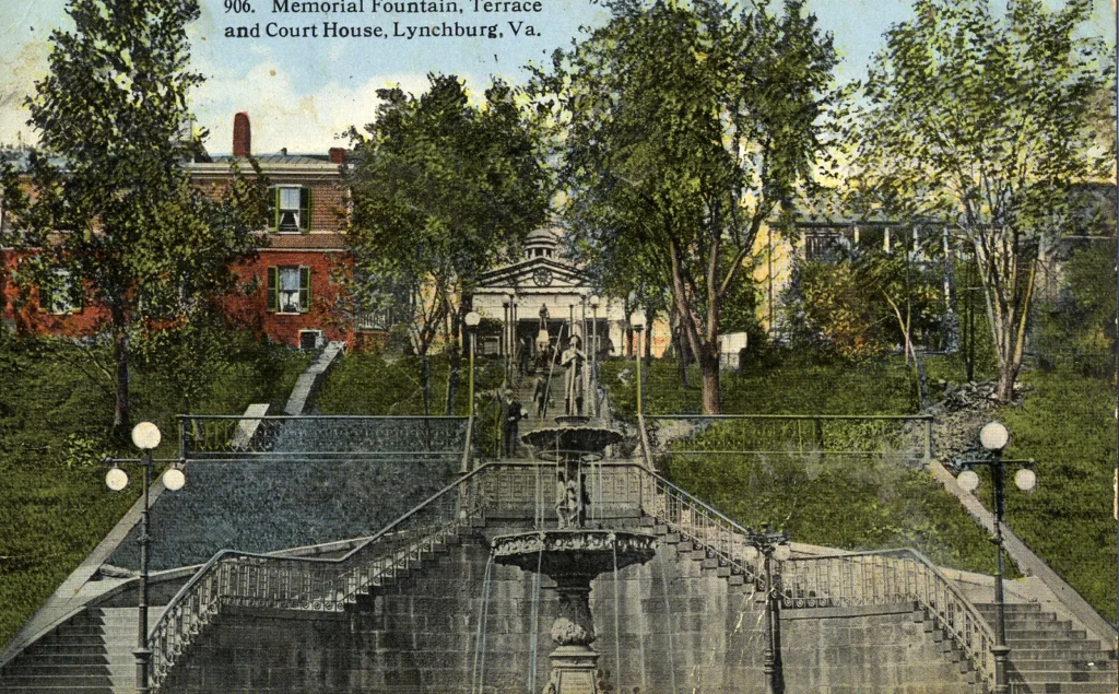 In true Hill City fashion, Lynchburg’s “public square” is a vertical series of terraces climbing one city block from Church to Court Streets. Although it was conceived as a grand war memorial, Monument Terrace is also a practical set of pedestrian steps that connect two busy downtown streets, the Lynchburg Circuit Court Clerk’s Office, First Unitarian Church, and Mr. Elder’s Rose Garden. The National Register for Historic Places describes Monument Terrace as “one of the most impressive urban focal points in Virginia.” The entire ensemble of terraces, with the Doughboy statue and pool at the bottom and the 1855 Old Court House at the top, is the iconic heart of downtown Lynchburg.