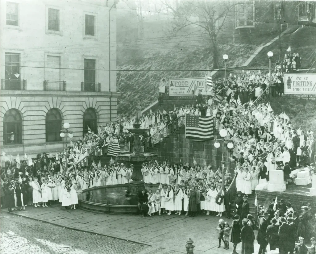 In the early 1920’s, energized by the economic prosperity of the decade and the new “city manager” form of local government, the Monument Terrace we know today began taking shape. Lynchburg’s first city manager Edward A. Beck is credited with originating the idea of transforming the old Ninth Street Steps into a modern civic space and memorial for local men who served in the recent “World War.”