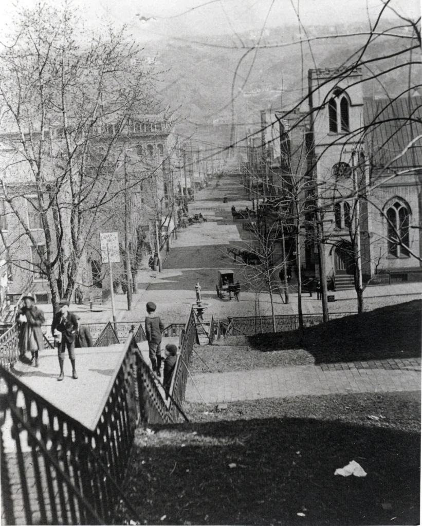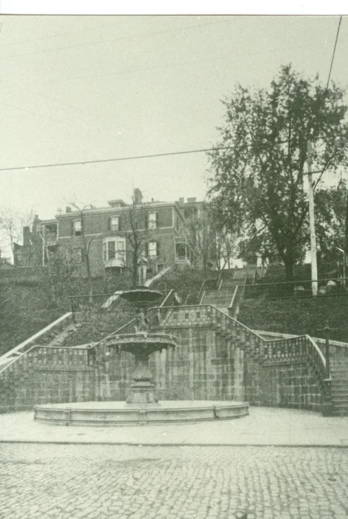 Monument Terrace was first developed as a public space in the early 1880’s. August Forsberg, the city engineer, was asked to provide a better route for citizens to move along the steep hill between Church and Court Streets. Forsberg designed a series of steps and landings down from Court Street that culminated in a large semicircular staircase at the intersection of Ninth and Church Streets. In the center of the stairs he planned a simple iron fountain.