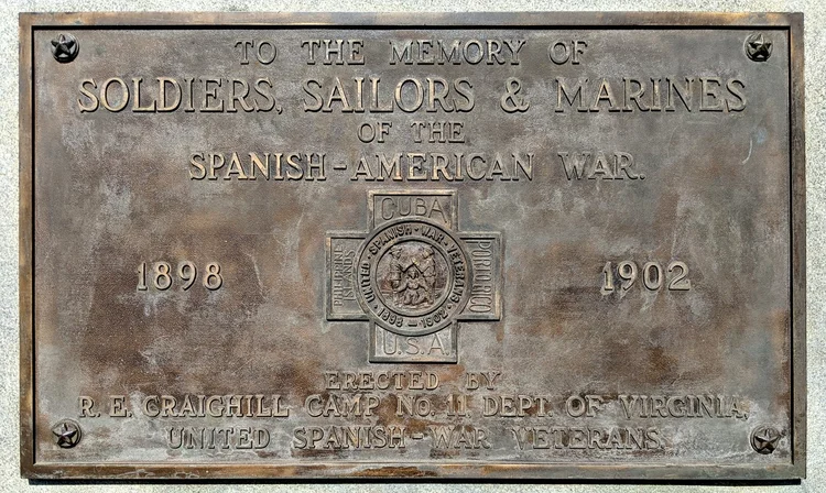 The first monument above the World War I sculpture and memorial wall is for the soldiers, sailors, and Marines who served in the armed forces during the Spanish-American War. This war lasted for only three months in 1898. The year "1902” on the bronze marker refers to the end of the U.S. occupation of Cuba and the establishment of the Republic of Cuba. The marker was erected in 1940 by the R. E. Craighill Camp No. 11, United Spanish-War Veterans.