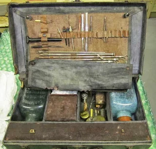 After Sampson Diuguid’s death in 1856, the business passed to his sons, and by 1880 his son George and grandson William were partners in the family firm. Inspired by seeing President James Garfield’s coffin during his elaborate 1881 funeral, this father and son team invented the wheeled catafalque, also called a church truck, which is still used to roll caskets down narrow aisles.(4) Grandson of the founder, William Diuguid, carried the firm into the 20th century and owned the funeral home at the time when embalmer William A. Shaw would have used this kit. William Diuguid’s daughter Mary Sampson Diuguid, great-granddaughter of the founder, operated the funeral home from 1927-1948 and had a reputation for conducting weekly cleanliness inspections of the facility.