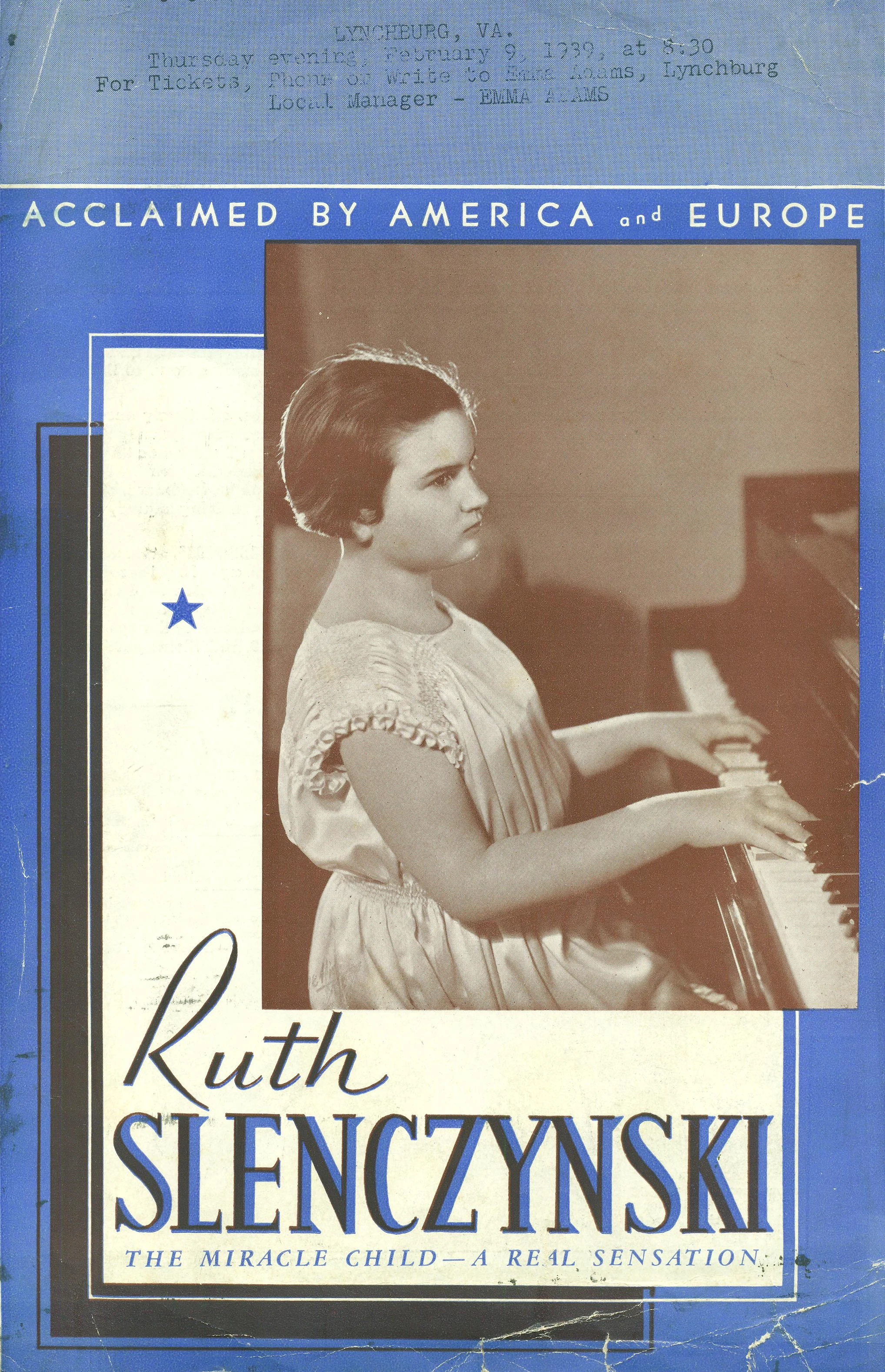 Slenczynska played in Lynchburg on February 9, 1939 at the age of 14. The handbill advertising for her concert boasted, “since her New York debut, she has blazed a triumphant trail across the country and back with headlines that are rhapsodic eulogies. …Her dimpled, chubby hands with a span of one key above an octave, effortlessly encompass everything in piano literature with a gorgeous aplomb. …Yet there is nothing showy to this lovable, healthy Miss bubbling over with the joy of living, equally charming in womanly serenity or childlike simplicity.”