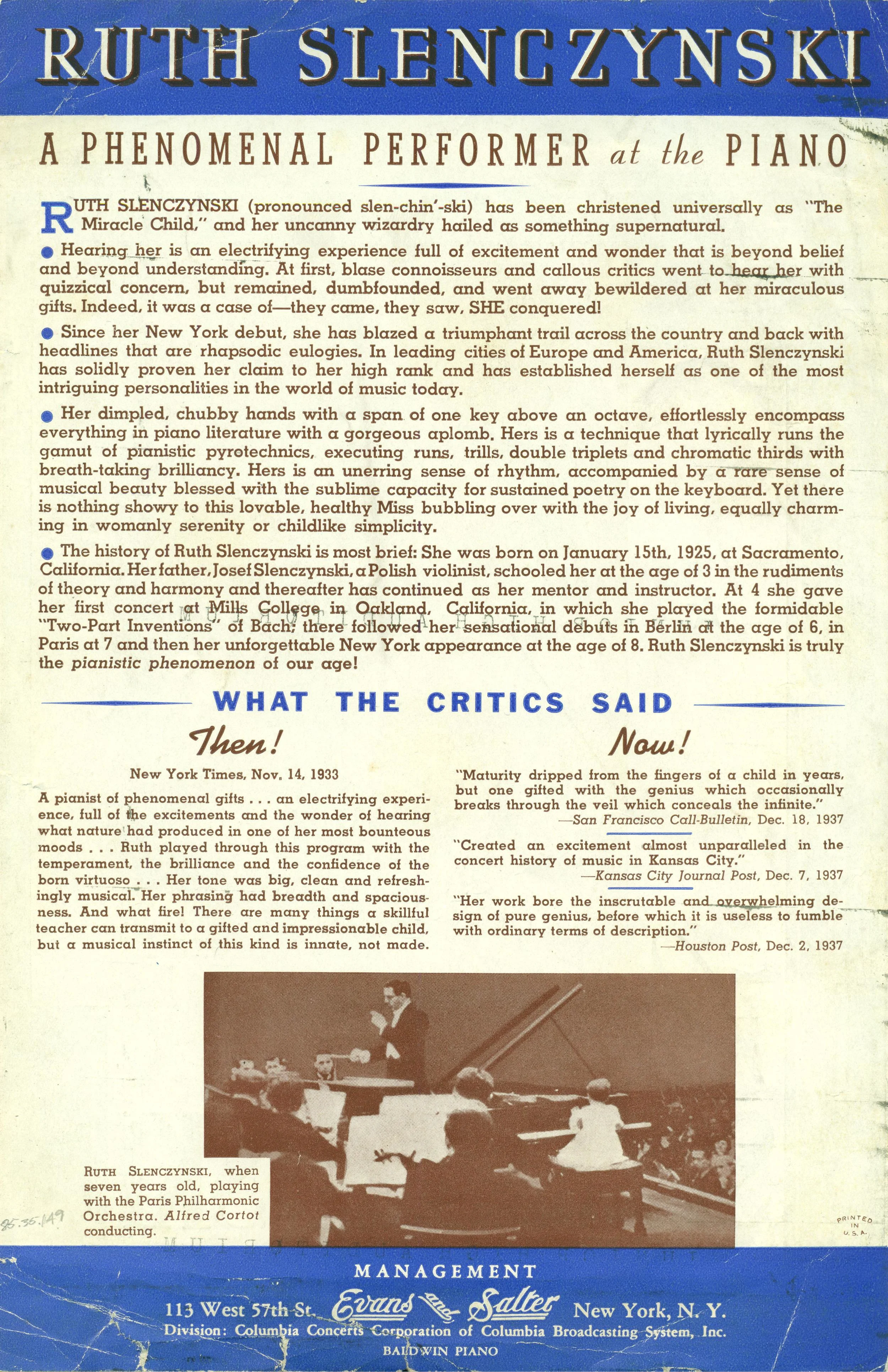 Ruth Slenczynska was born in Sacramento, California on January 15, 1925. She gave her first professional recital at age four at Mills College in Oakland, California, playing Bach, Haydn, and Beethoven. Her father, Josef Slenczynski, was a Polish violinist who recognized his daughter’s musical abilities when she could hum melodies back to him in perfect pitch at 16 months old. When she was three, he implemented a daily regime for her: nine hours of practicing interrupted briefly with tutoring in reading, writing, and geography.