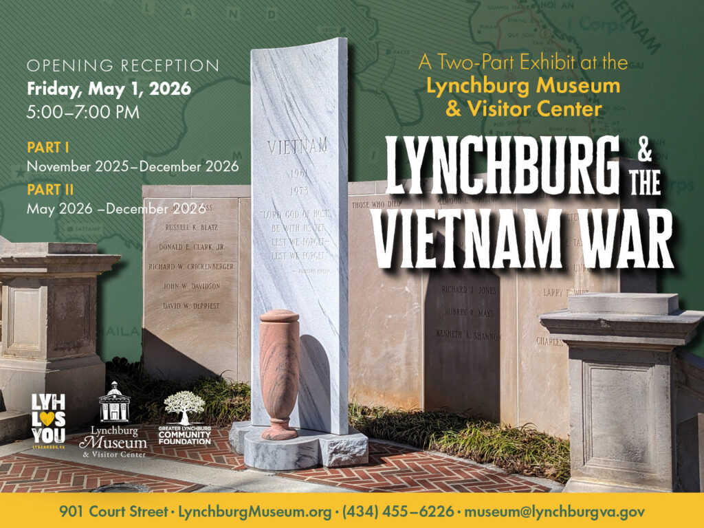 As Part II of “Lynchburg & The Vietnam War” opens May 1, the Lynchburg Museum System invites visitors deeper into the human connections of the Vietnam War. The heart of the exhibit continues to honor the 27 Lynchburg men killed in action, alongside items from POW David Harker and artifacts from local Vietnam veterans. While the exhibit continues to center and honor local service members and their sacrifices, Part II broadens the story to reveal how the war was lived both abroad and at home.