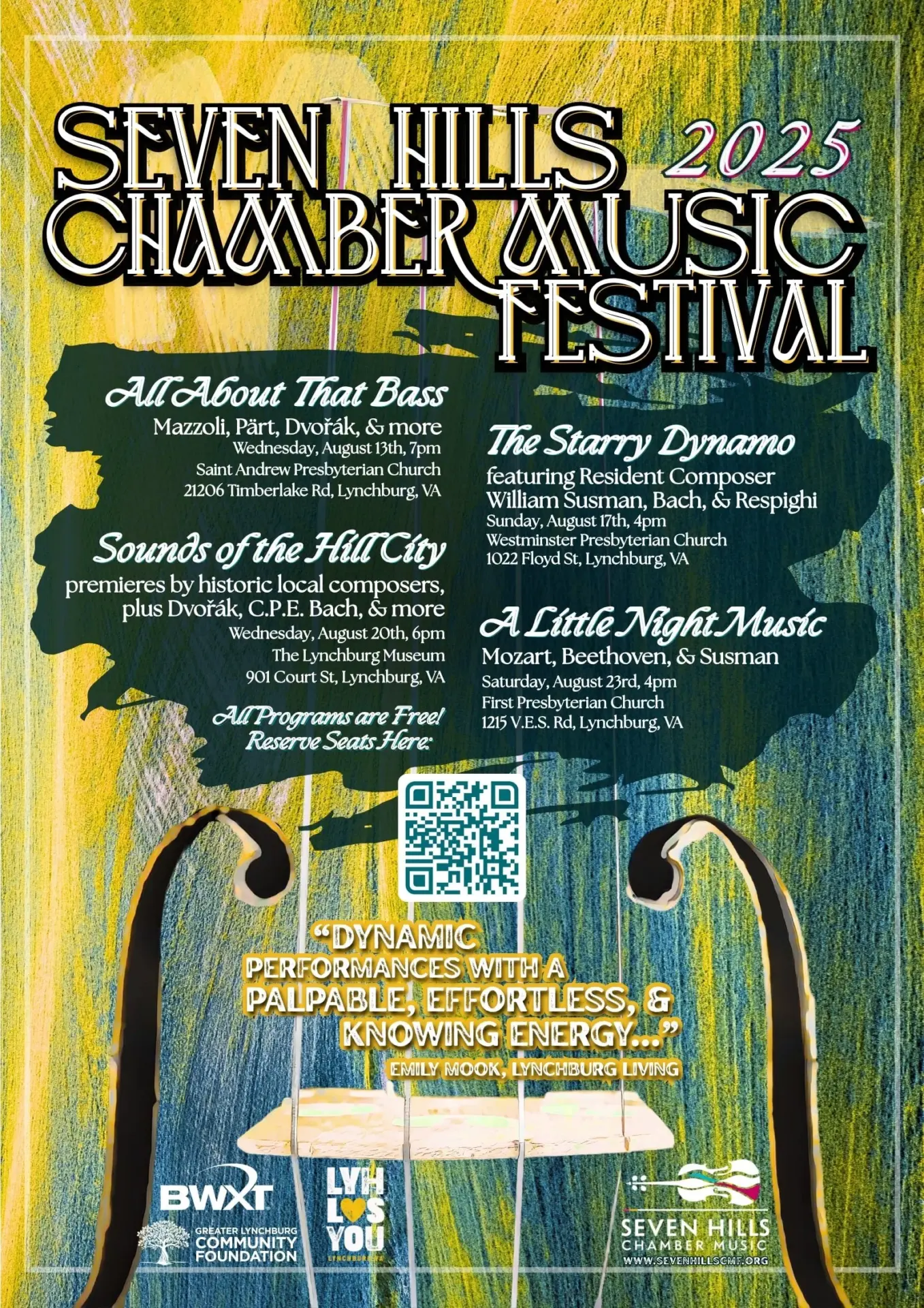 In collaboration with the Lynchburg Museum, Seven Hills Chamber Music Festival presents this interdisciplinary concert that blends performance with local history and storytelling. Held in the museum’s main gallery on Court Street, “Sounds of the Hill City” will premiere works by historic local composers and bring hidden stories to life through music. Featured prominently will be music for flute and violin, in homage to the historic duo, Blind Billy & Thomas Perkins. Other repertoire includes Dvořák’s “American” String Quartet, Reena Esmail’s luminous Nadiya for flute and viola, and the delightfully quirky Stir Crazy by Carlos Simon, in addition to music by Lynchburg’s own Louis Schehlmann and Gennaro Bozzaotra.