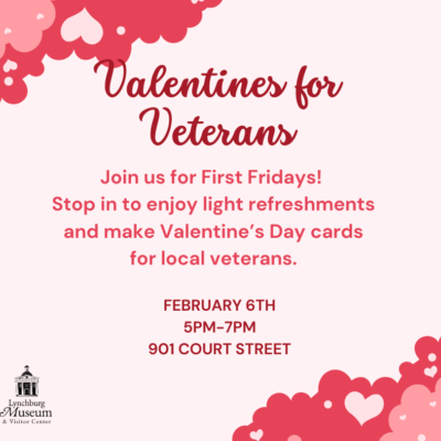 FreeJoin us Friday, February 6, from 5pm to 7pm to make Valentine’s Day cards for local veterans! These cards will be taken to Monument Terrace on February 13th during the veterans gathering. All supplies and light refreshments will be provided.