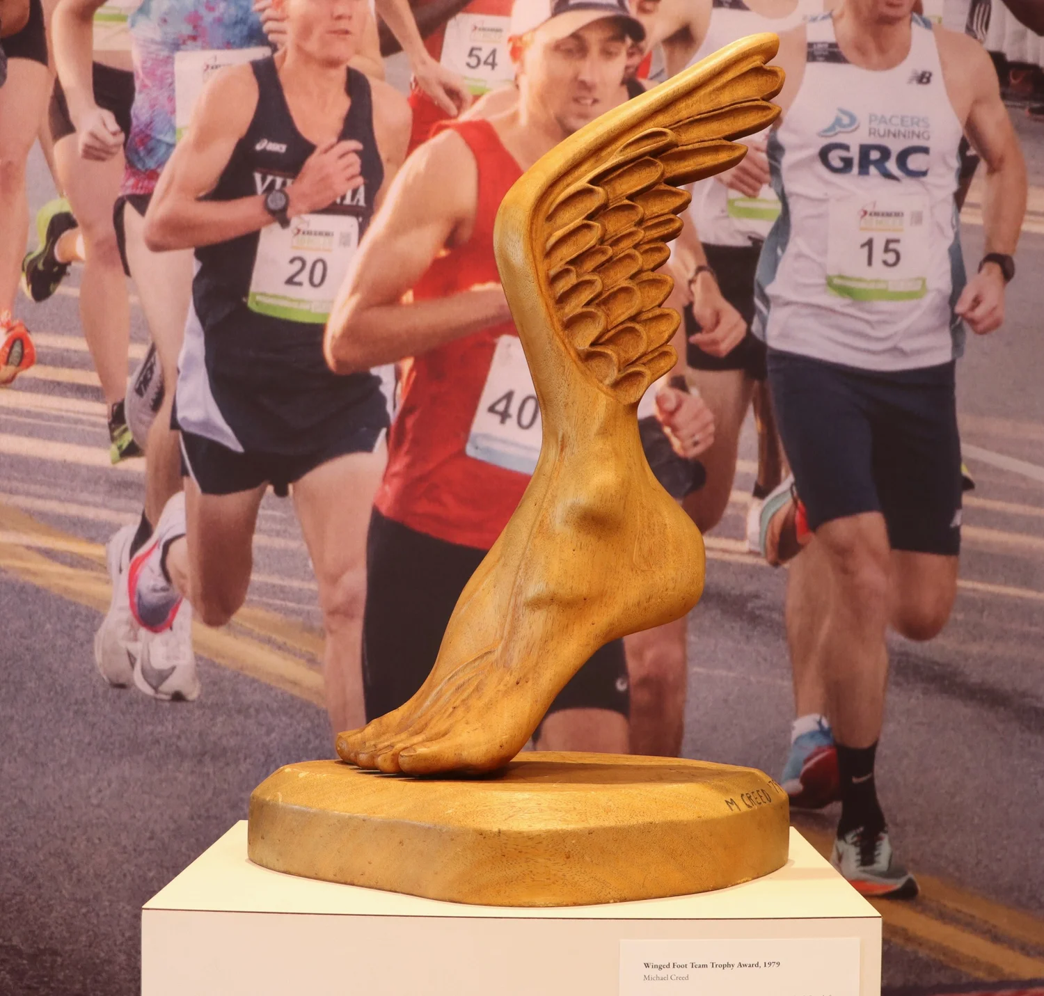 This wooden trophy was crafted by local artist, Michael Creed, for the winning team of the 1979 Virginia 10 Miler. The British team, the Gateshead Harriers, beat out both the Frank Shorter Racing Team and the Bill Rodgers-led Greater Boston Track Club to capture the top team honors. Brendan Foster, team captain, was presented with the trophy. Due to the size of the sculpture, the international athletes left it with their host family here in Lynchburg, Dr. and Mrs. William H. Barney.