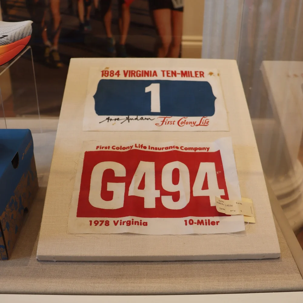 This bib belonged to Finnish Olympian Lasse Virén, who ran in the 1978 and 1979 Virginia 10 Milers. Loan courtesy of David Barney