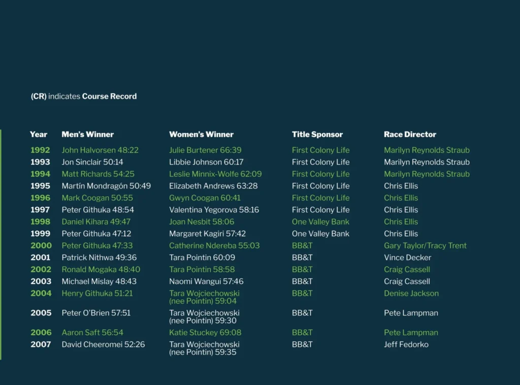Special Thanks to Leslie McPhatter, Bret Boman, Jeff Fedorko, and the Lynchburg Road Runners Club