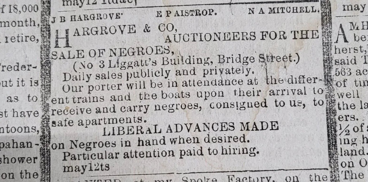 The Hargrove & Company slave auction and brokerage business of Lynchburg was operated by James B. Hargrove, E. P. Aistrop, and N. A. Mitchell. Their business received enslaved people for consignment and could temporarily house them until they were sold or rented. The main office was located on Ninth Street (then called “Bridge Street”).