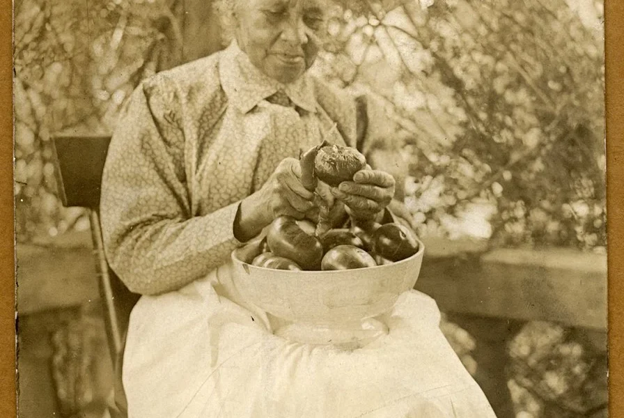 Circa 1900–1910, Lynchburg Museum System Collection | Martha Spence Edley was born enslaved in Virginia in 1826. She worked as a “housemaid” for several generations of the same Lynchburg family, both before and after Emancipation. She is shown here peeling tomatoes on the porch of her employer’s residence in Rivermont. Edley died in 1920 at age 94 and was buried in Lynchburg’s Old City Cemetery with her husband and young children.