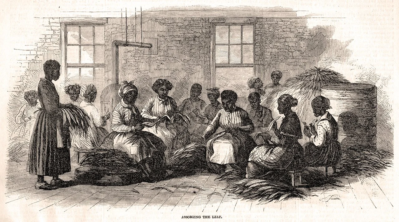 This engraving depicts Black women sorting tobacco leaves in a Lynchburg factory one year after Emancipation. The Hill City was a nationally recognized producer of “plug” or chewing tobacco throughout the 19th century. Virtually all of the laborers in these factories—both before and after the Civil War—were Black men, women, and children. Their labor fueled Lynchburg’s economy and made many of its tobacconists very wealthy.