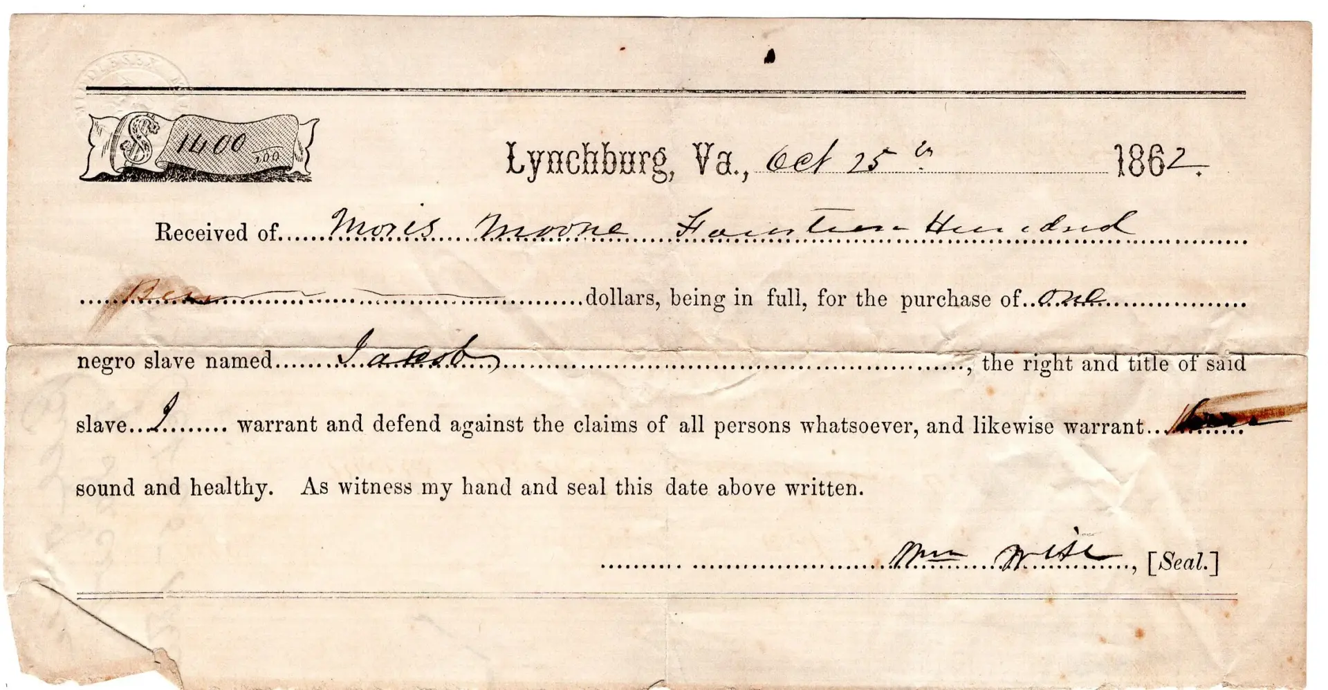 This pre-printed receipt was filled out for the sale of “one negro slave named Jacob” from William Wise to prominent Lynchburg tobacconist Maurice Moore (recorded here as “Morris Moore”). The sale price was $1,400. The receipt attests that Jacob was “sound and healthy.” Wise’s residence and occupation are unknown.