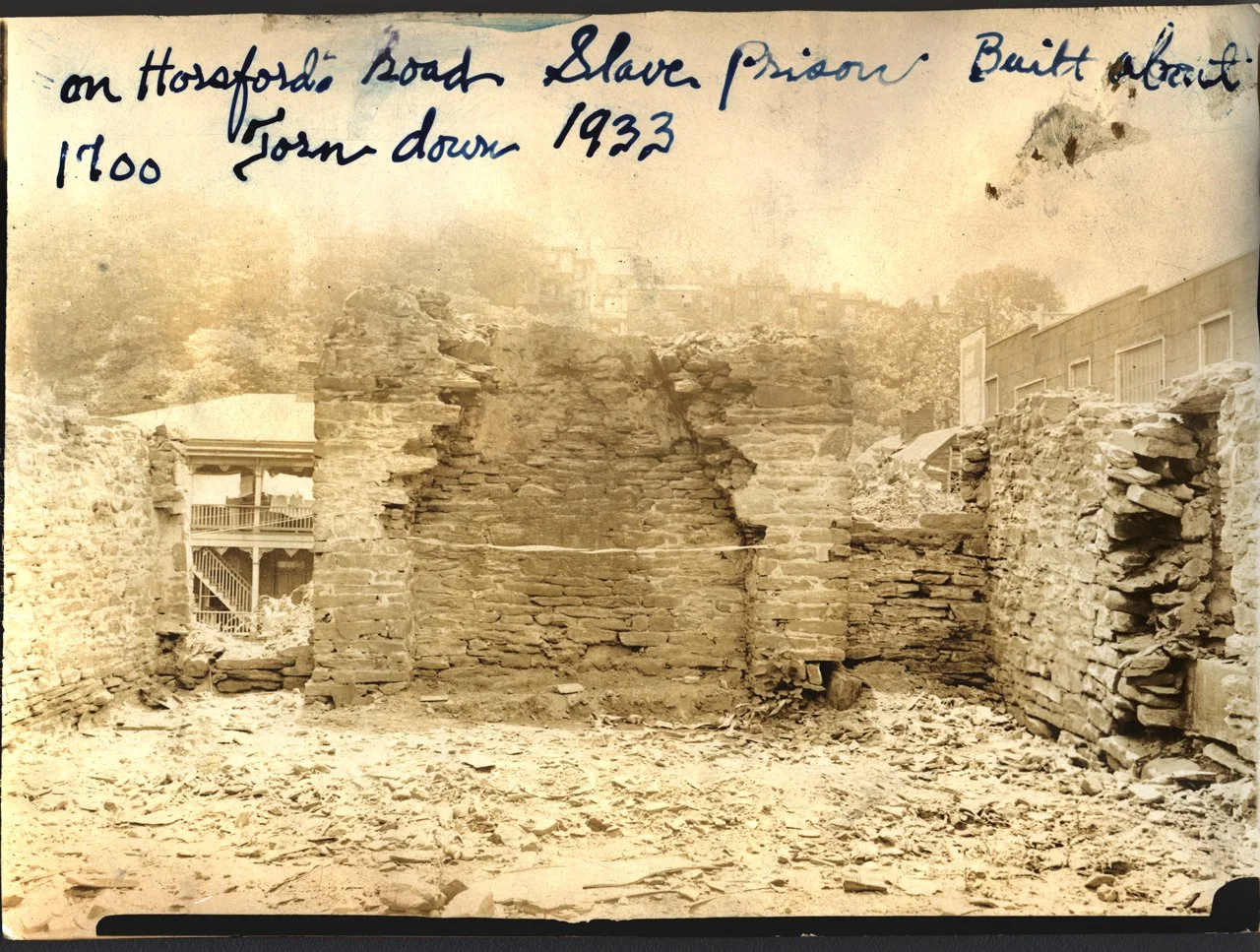 The label on this photograph suggests there was an old slave “prison” or jail on Horseford Road in downtown Lynchburg. The structure was supposedly built in the 18th century and demolished in 1933. Neither the location nor the owner has been confirmed.