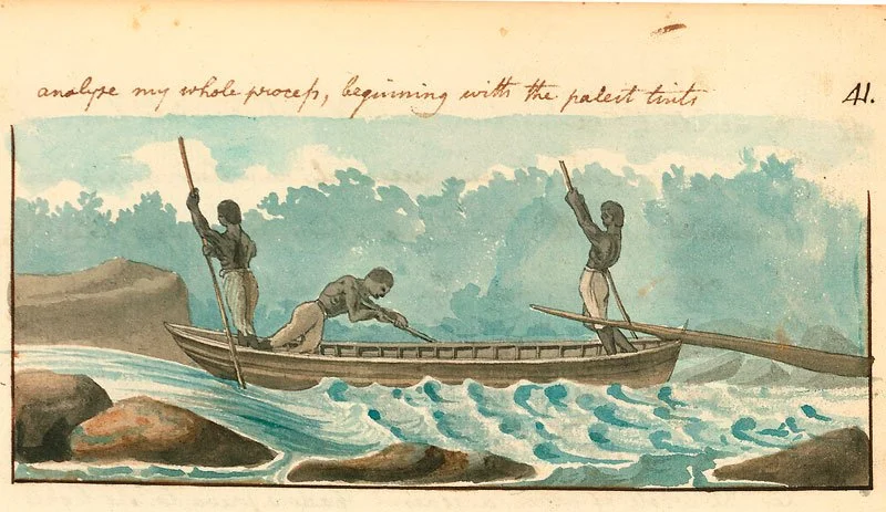 In this watercolor painting, Latrobe depicts three Black men, who were likely enslaved, directing a bateau through the rapids of the James River at Richmond. These long flat-bottomed boats were used to carry goods such as tobacco and coal along rivers and canals as late as the 20th century. Between the 1770s and the 1840s, hundreds of men operated such boats along the James River between Lynchburg and Richmond. In the journal entry that accompanied this illustration, Latrobe noted that it was inaccurate. The boat he painted was “too short: they are from 60 to 75 feet long, & from 5 to 6 feet broad.” He went on to describe that each bateau (sometimes spelled batteau) was “managed by 3 Men,” one to steer while the other two poled, and “who with great dexterity often carry them 30 miles against the stream in one day.” Batteaux poled and steered by enslaved men were common sights in Lynchburg, which was connected to Richmond by the James River.