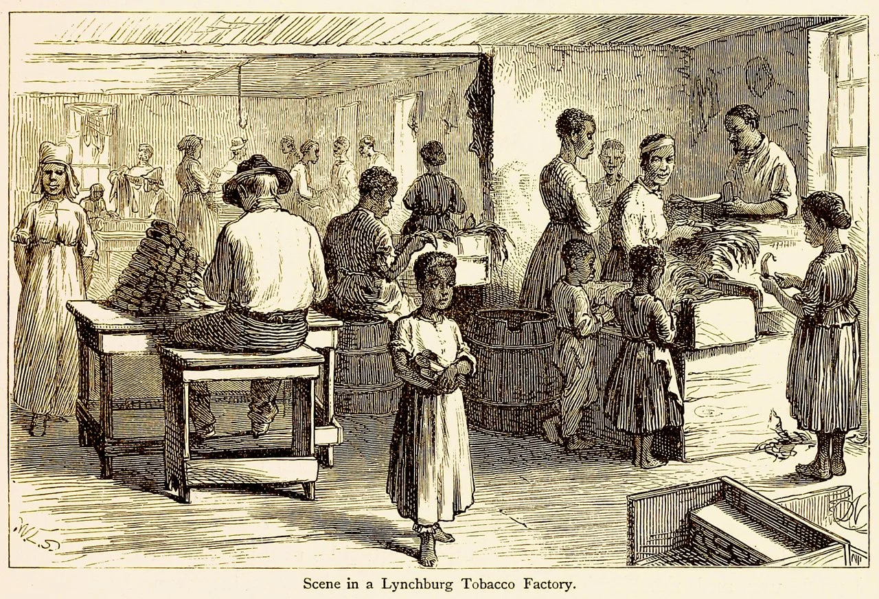 “The men and women working around the tables in the basements of the Lynchburg tobacco establishments croon eccentric hymns in concert all day long; and their little children, laboring before they are hardly large enough to go alone, join in the refrains. Tobacco is the main article of Lynchburg trade. Buyers from all parts of the Union crowd the streets; the warehouses are daily visited by throngs.”
