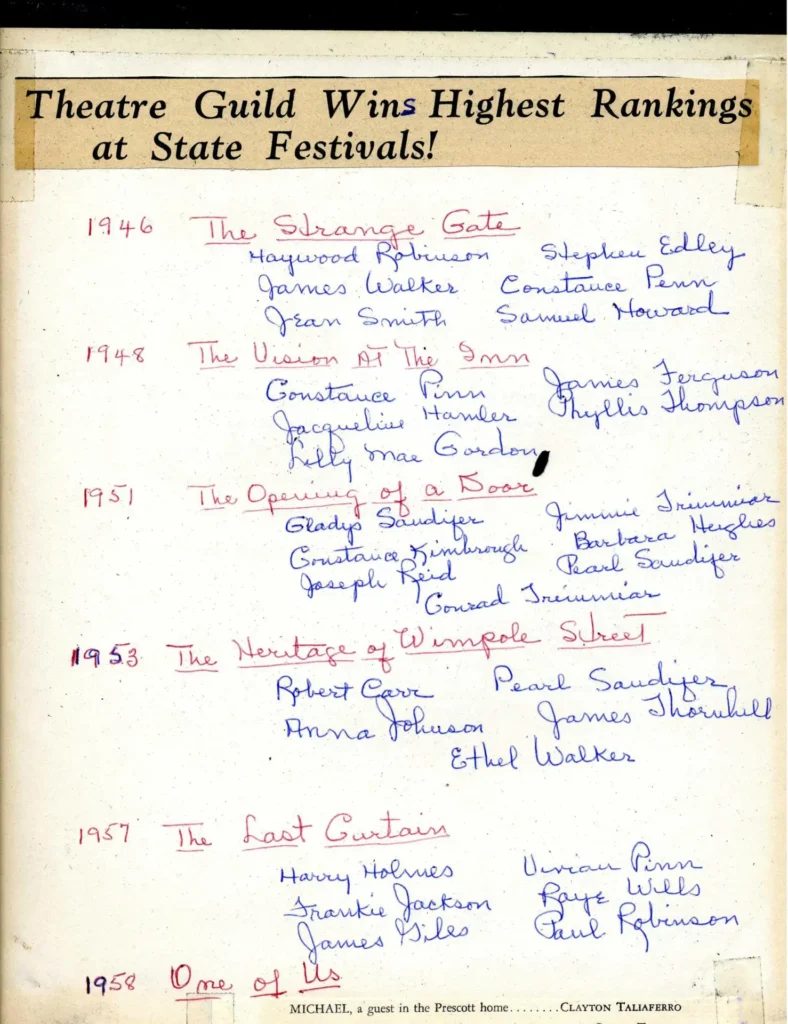 PC: The Other Shepherd 1953 PC: Stage for Little Miss Somebody PC: Playbills PC: Anne of Green Gables 1954 PC: The Bishop's Mantle playbill PC: The Bishop's Mantle 1955 PC: The Bishop's Mantle 1955 PC: The Bishop's Mantle 1955 PC: Playbills PC: East Lynne playbill PC: East Lynne 1956 PC: East Lynne 1956 PC: Thespian Society 1963